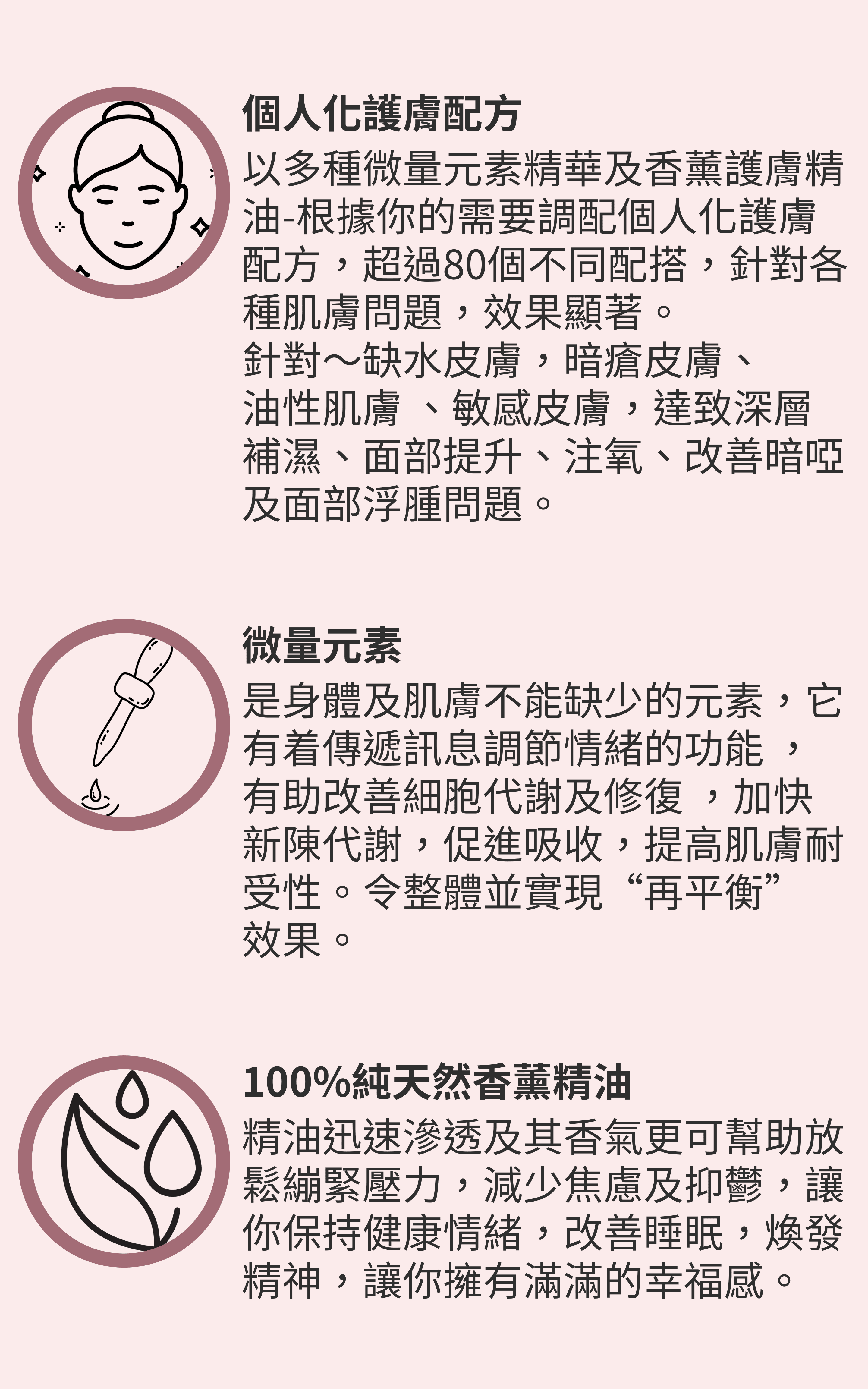 療程使用來自意大利100%天然成分微量元素及香薰護膚精油,調配個人化護膚配方,超過80個不同配搭,能滿足各種皮膚需求,效果顯著。